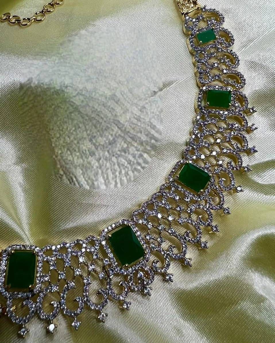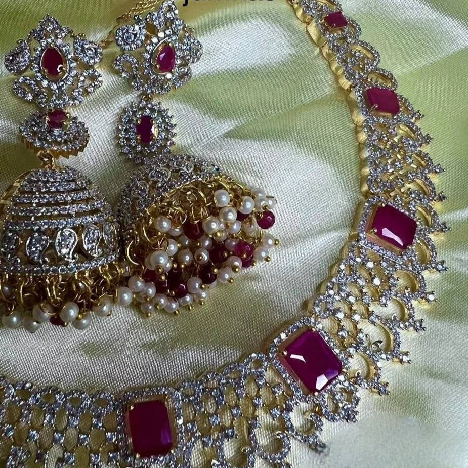 Expertly crafted with sparkling diamonds, deep green emeralds, and bold red rubies, this choker set will elevate any outfit. Complete the look with the stunning jhumka earrings, adding a touch of elegance and sophistication. A must-have for any jewelry collection.
