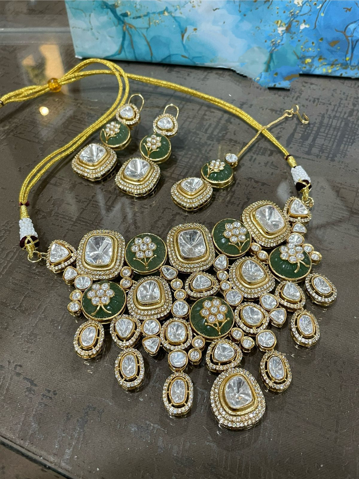 Elevate your bridal or festive look with this high-quality Kundan choker set, exquisitely handcrafted with intricate detailing. This complete jewelry set includes a beautifully designed choker necklace, matching earrings, and a coordinating maangtikka—perfect for weddings, sangeet, receptions, or any grand celebration.