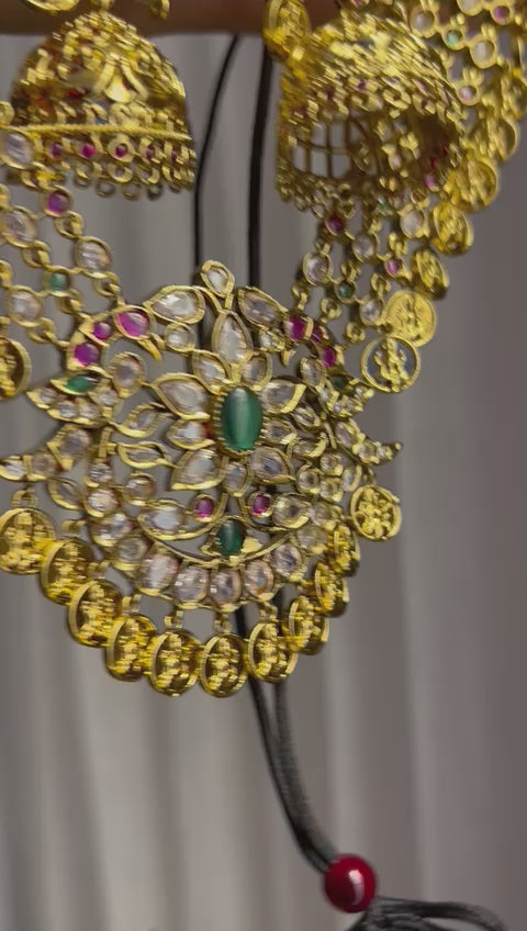 Unveil your timeless beauty with this radiant set featuring real ruby and emerald stones. The elegant long Maati jhumkas add an exquisite touch to the traditional Laxmi kasulu design. Handcrafted with care, this set exudes luxury and sophistication. Perfect for special occasions or as a statement piece in your collection.