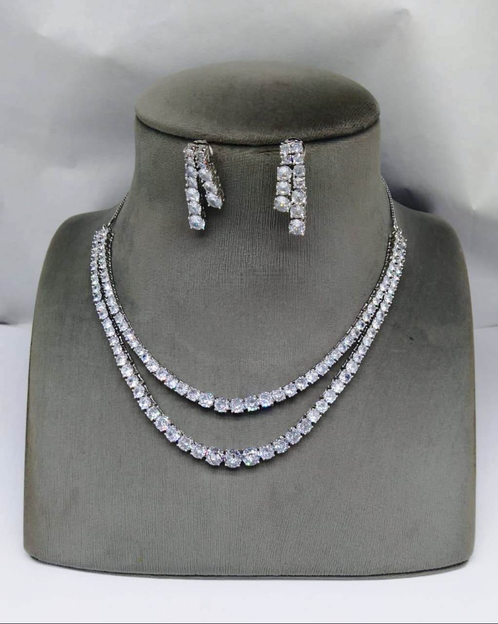 Dazzling Duets , American Diamond Double Strand Necklace with Earrings Set . Diamond jewelry set , short nekclace set