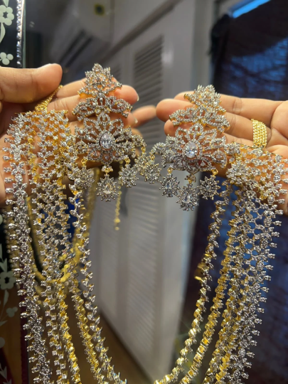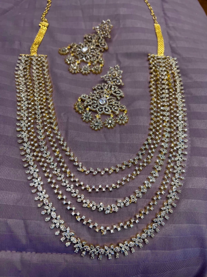 High Quality 5 Lines Diamond Grand Heavy set with 4 inches screw back long grand earring•southindian trending haram