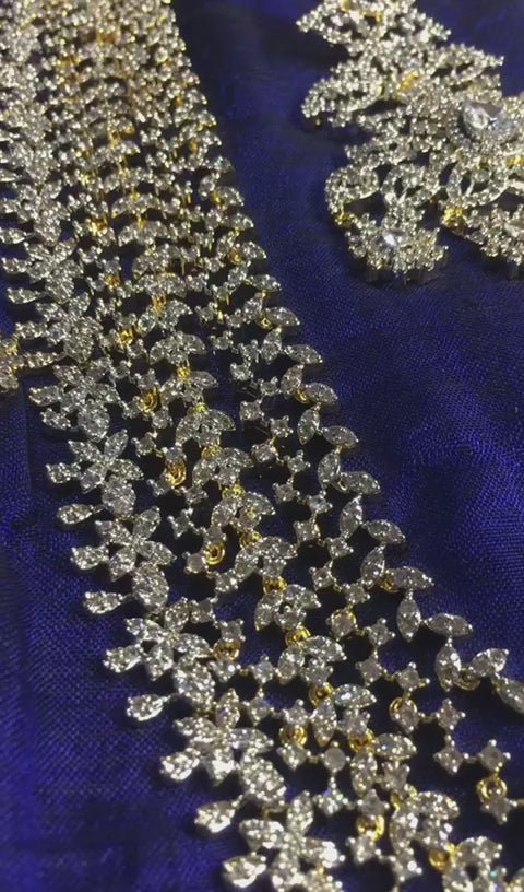 Elevate your style with this high quality line diamond grand set. It features a 4 inch screw back and long grand earrings, perfect for a South Indian haram style. Add a touch of elegance and trend to your look.