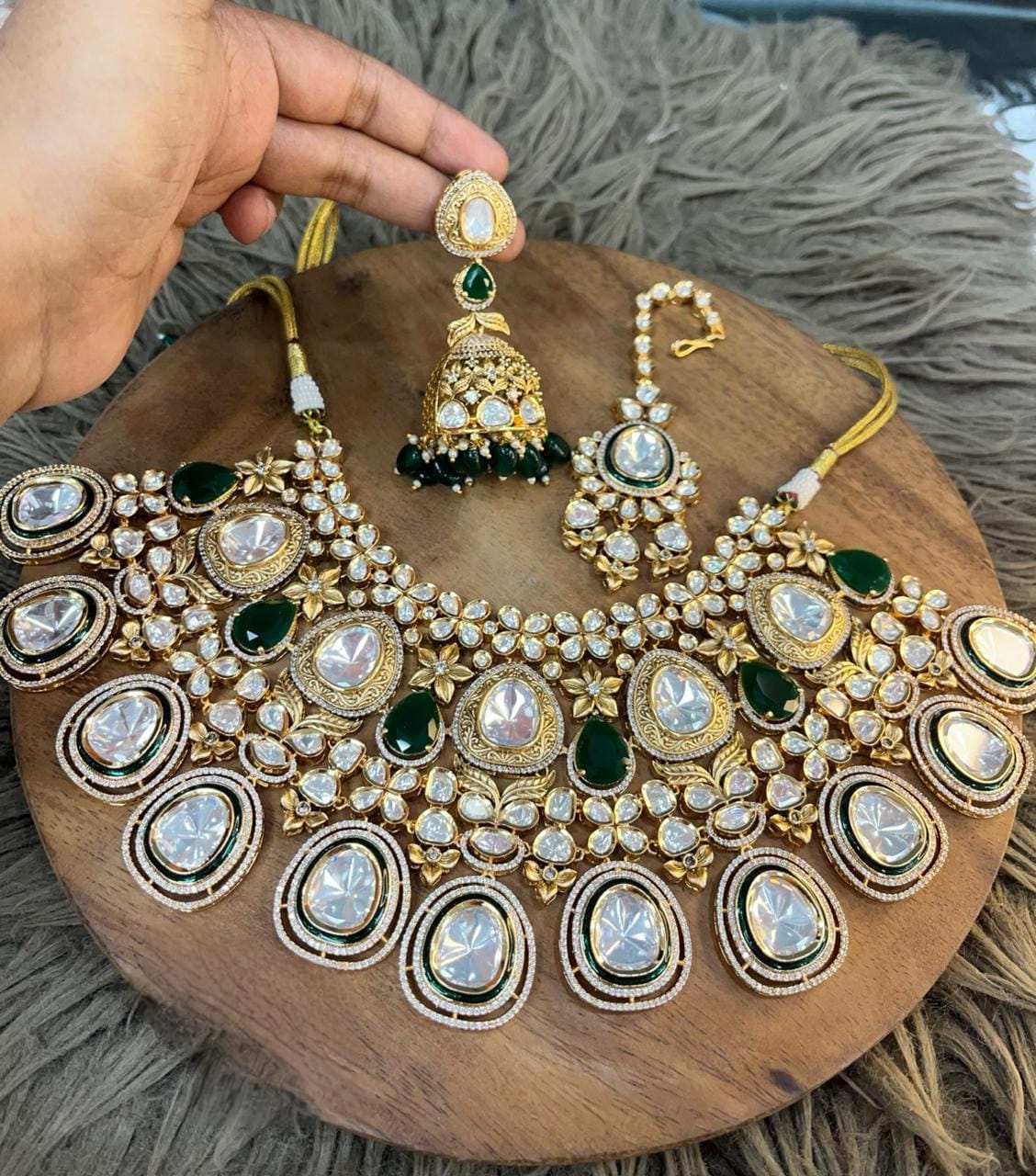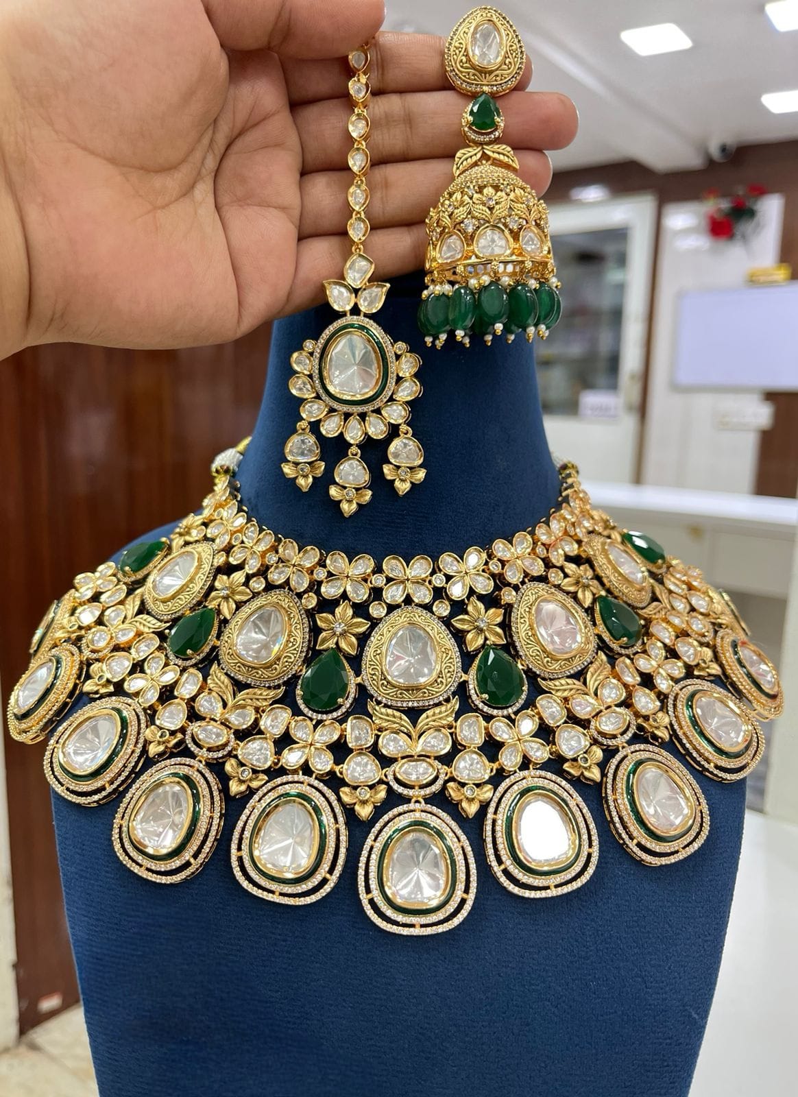 Elevate your traditional look with this exquisite high-quality Kundan choker jewellery set, perfect for weddings and festive occasions. The set features a beautifully crafted Kundan choker, adorned with intricate detailing, adding timeless elegance to your attire. Paired with matching Jhumka earrings and a stunning maangtikka, this set enhances your ethnic ensemble with a regal charm. The vibrant stones and delicate gold finish offer a luxurious feel, making it ideal for brides or anyone seeking to make a statement. Experience the perfect blend of craftsmanship and tradition with this premium Kundan jewellery set, designed to dazzle at any event.