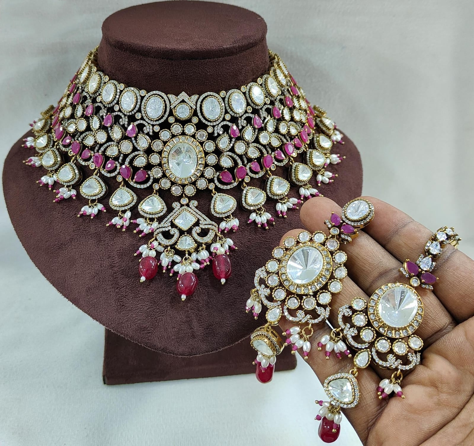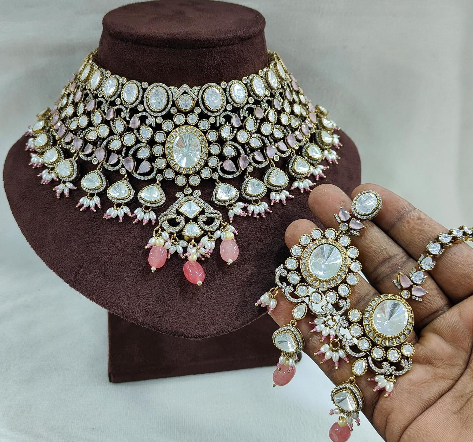 Indulge in regal elegance with our Luxury Moissanite Kundan and American Diamond Choker Set, a masterpiece designed for those who cherish timeless beauty and craftsmanship. This premium set includes a stunning choker necklace, intricately designed dangling earrings, and a perfectly coordinated maangtikka — all embellished with radiant Moissanite stones, rich Kundan detailing, and shimmering American Diamonds.