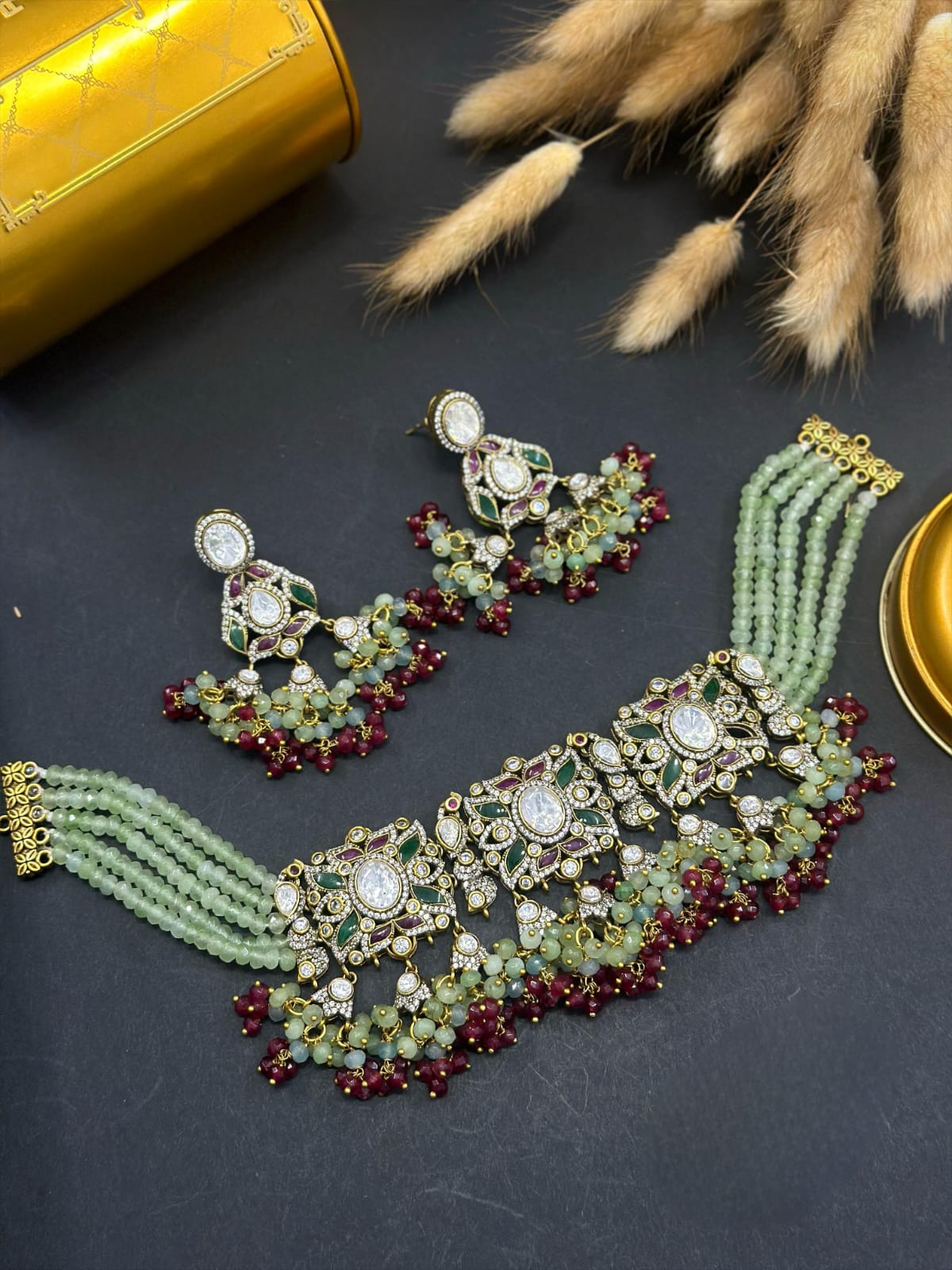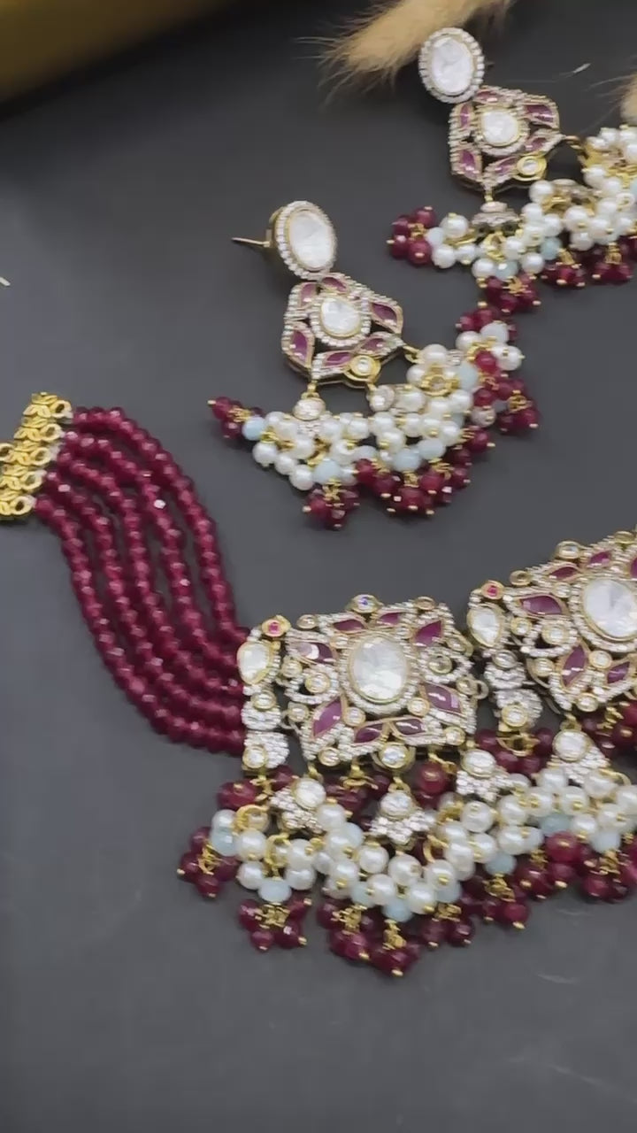 Elevate your bridal allure with our Polki Kundan Choker Set, a masterpiece of traditional Indian bridal jewelry that makes a captivating wedding statement. This exquisite set features a resplendent Polki choker adorned with intricately set Kundan stones, blending classic charm with contemporary elegance. The matching earrings complement the choker, creating a harmonious ensemble. Handcrafted to perfection, this jewelry set is a tribute to timeless sophistication, making it the perfect choice for brides seeking to embody tradition with a modern flair. Make your wedding day unforgettable with this regal jewelry set that captures the essence of Indian heritage in every detail.