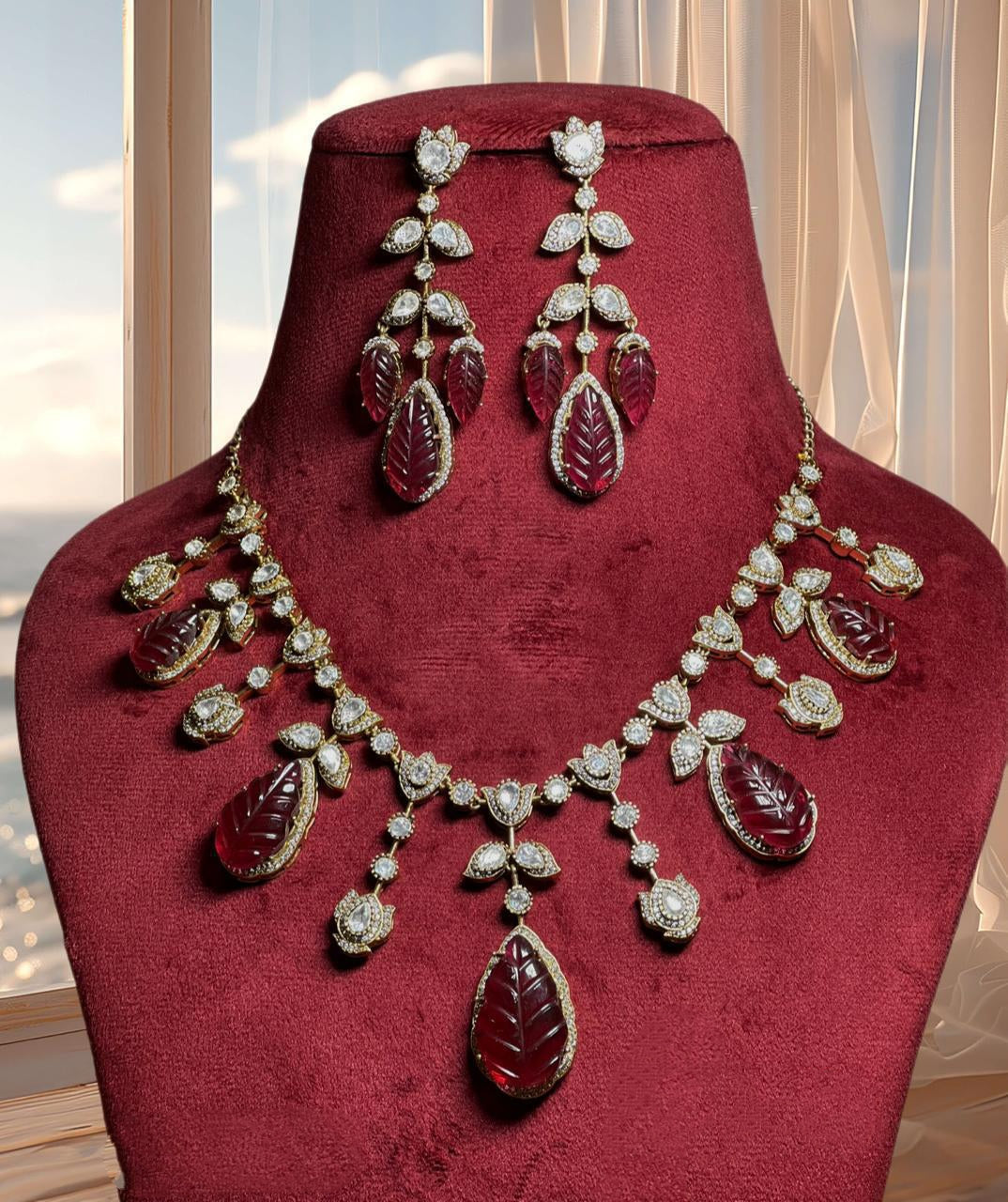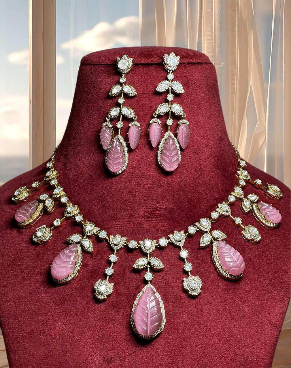 Premium Moissanite Kundan Strawberry Quartz Necklace Set | Handcrafted Jewelry with Earrings | Bridal & Festive Wear | Statement Ethnic Jewelry