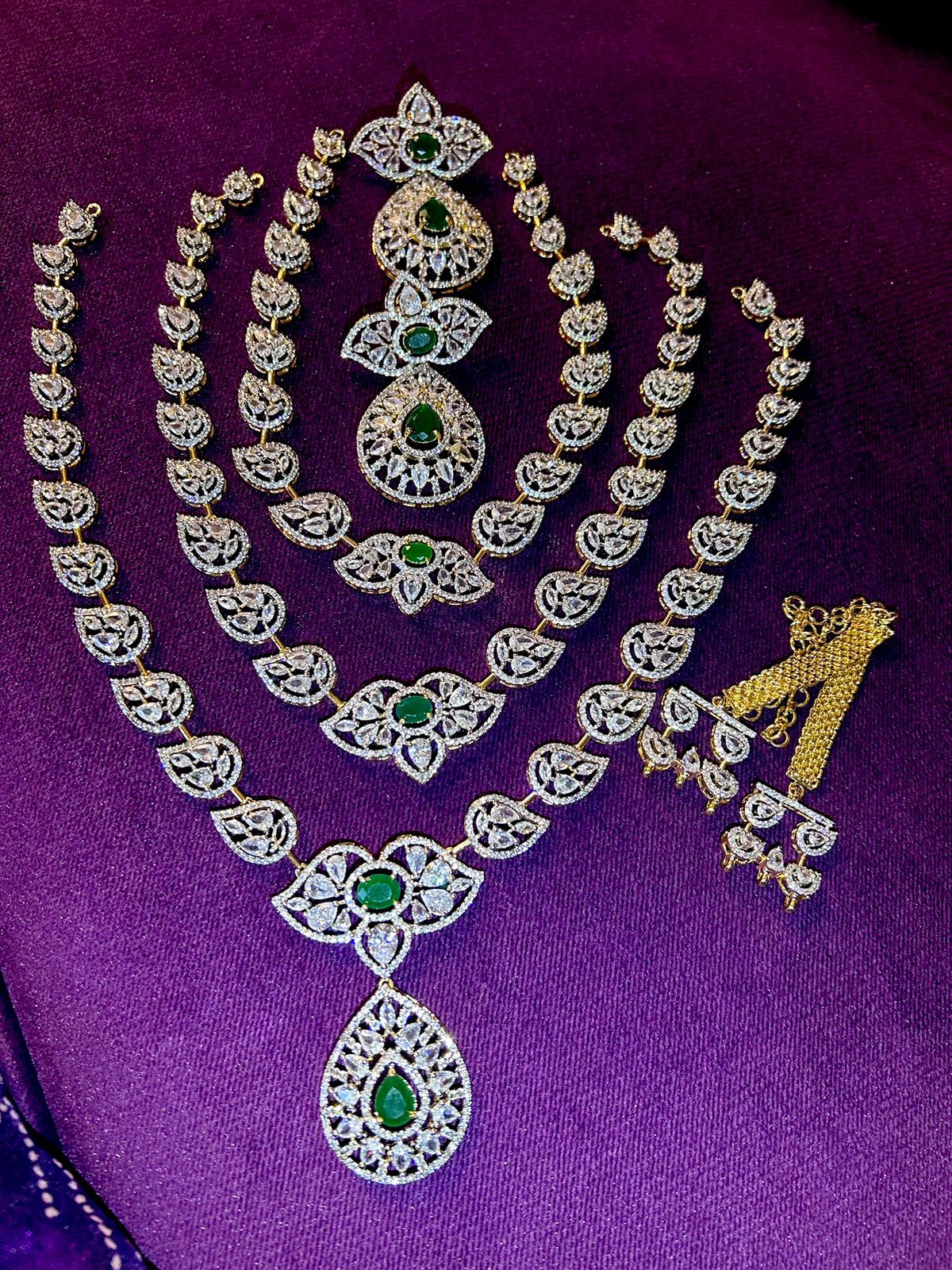 Premium Quality American Diamond 3 layer long haram set with Premium Earrings, southindian jewellery, indian jewellery