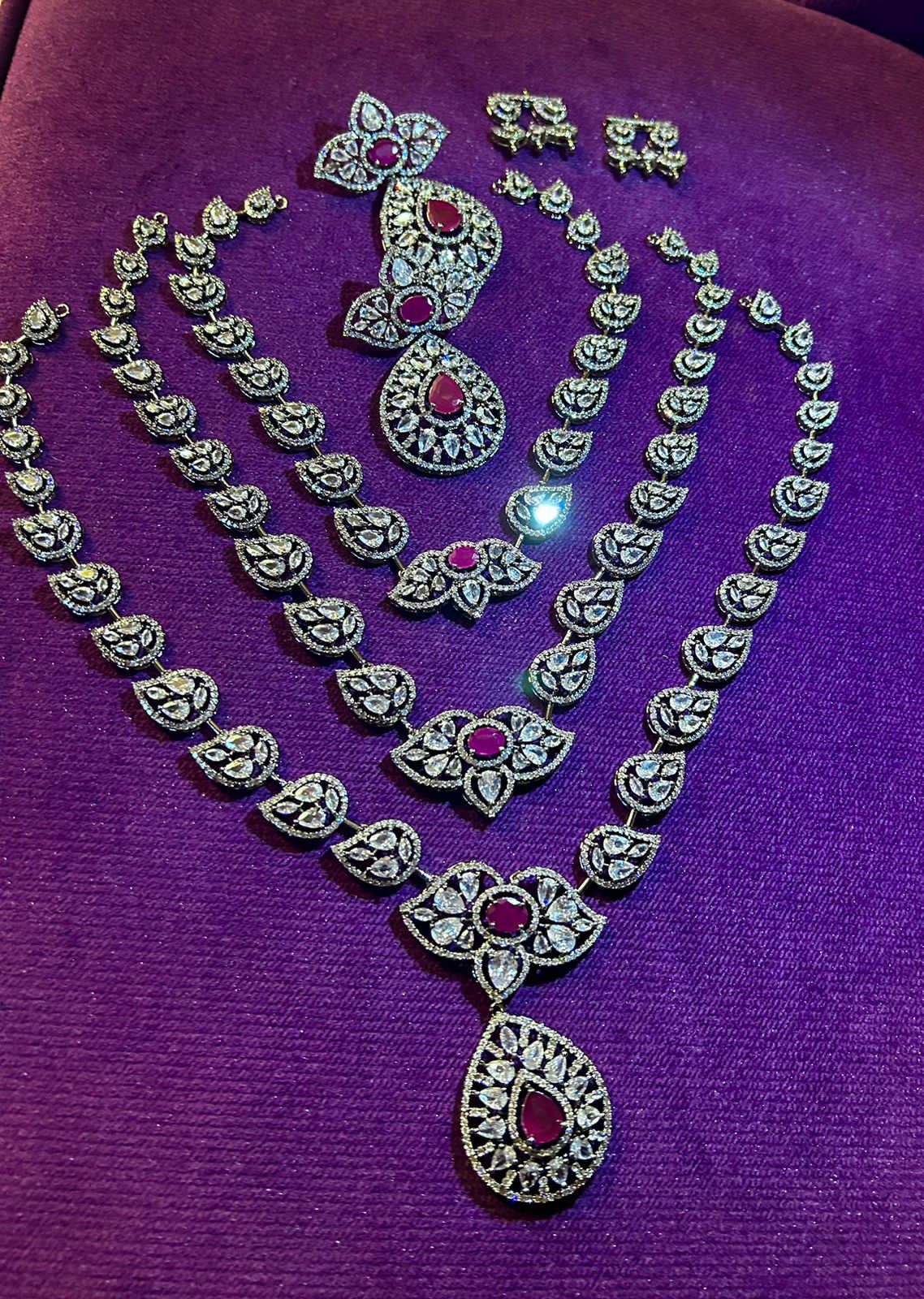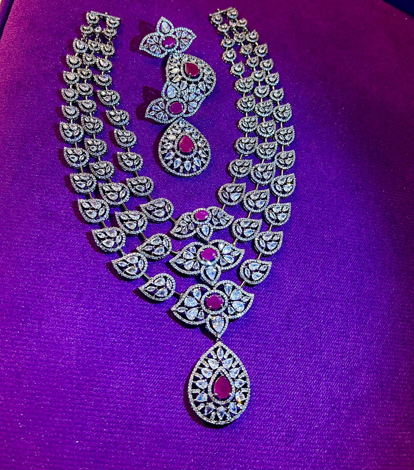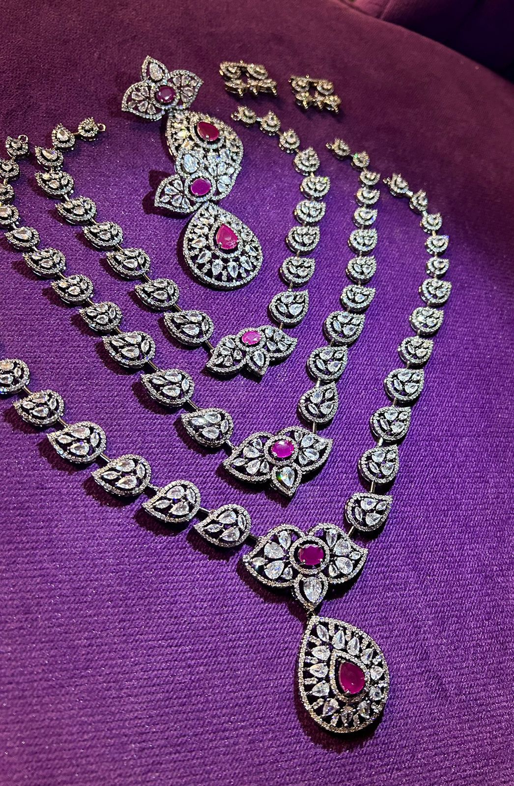 Premium Quality American Diamond 3 layer long haram set with Premium Earrings, southindian jewellery, indian jewellery