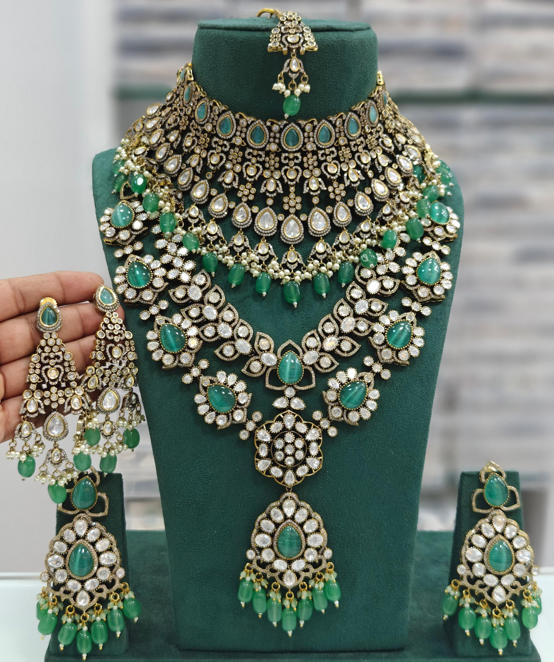 Premium Quality Bridal Pachi Kundan Choker with Long Haram, Double Earrings, and Maangtikka Set , Full Bridal Pachi Kundan jewellery set