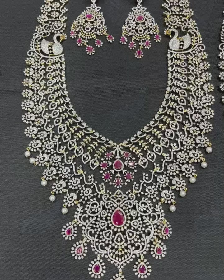 Elevate your look with this **High-Quality Long Haram Replica CZ Necklace Set**, a perfect blend of elegance and tradition. This stunning jewelry set features a **luxurious long haram necklace** intricately designed with **sparkling Cubic Zirconia (CZ) stones** and a matching pair of **beautiful earrings**. Ideal for weddings, festive occasions, and special events, this set adds a regal touch to any outfit.