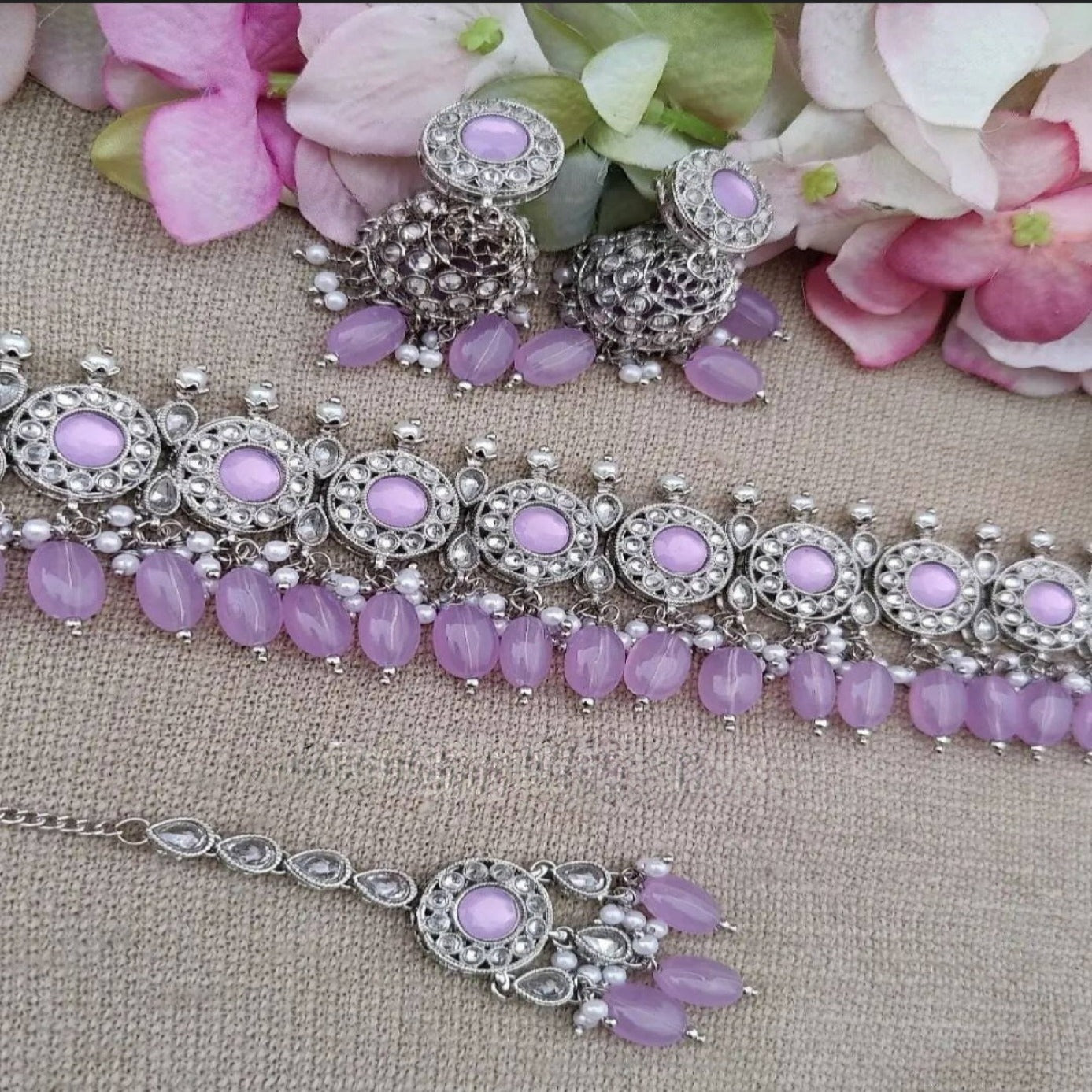 Elegant Lavender Polki Kundan Choker Jewelry Set with Jhumka and MaangTikka