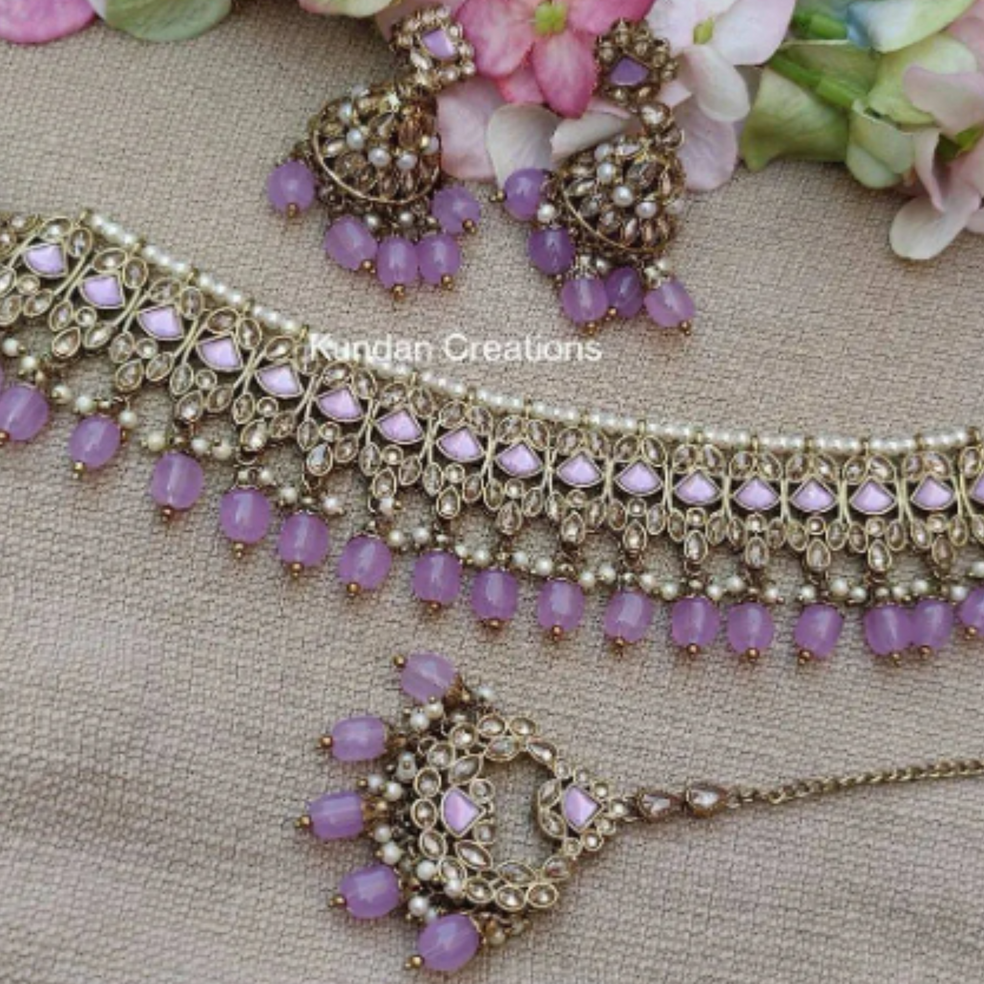 Embrace the enchantment of traditional Indian jewelry with a modern twist. Our Lavender Polki Kundan Choker Set is a celebration of artistry and culture, designed to make you feel like royalty on your special occasions. Order yours today from Sagunittujewel and experience the allure of Indian elegance.