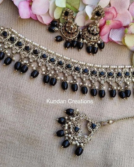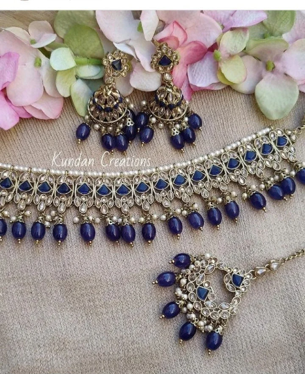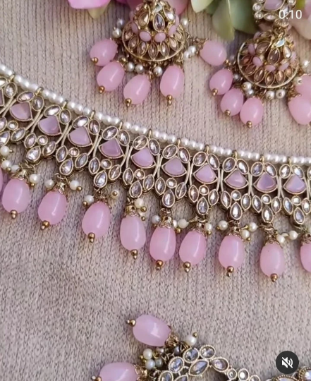 2. Intricate Polki Kundan Work: Adorned with meticulously crafted Polki Kundan stones, this choker set boasts intricate and captivating designs that reflect the rich craftsmanship of Indian jewelry.