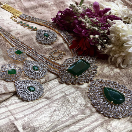 Experience the ultimate luxury with the Dazzling Elegance diamond set. Featuring exquisite South Indian jewelry, Adorn yourself with sparkling Big Earrings, Tikka, and Diamond Nath for a truly dazzling look. Elevate any outfit with these stunning pieces.