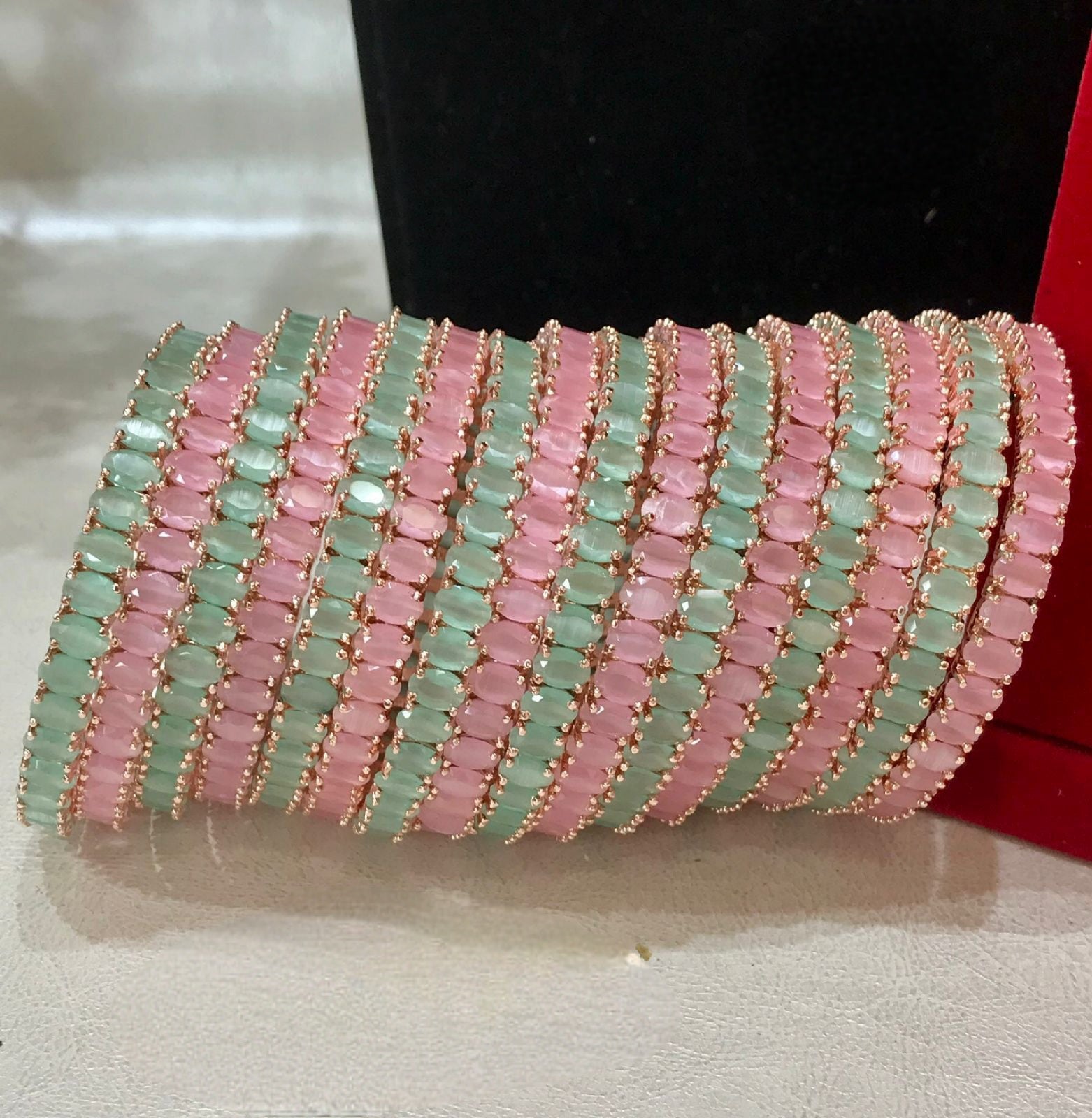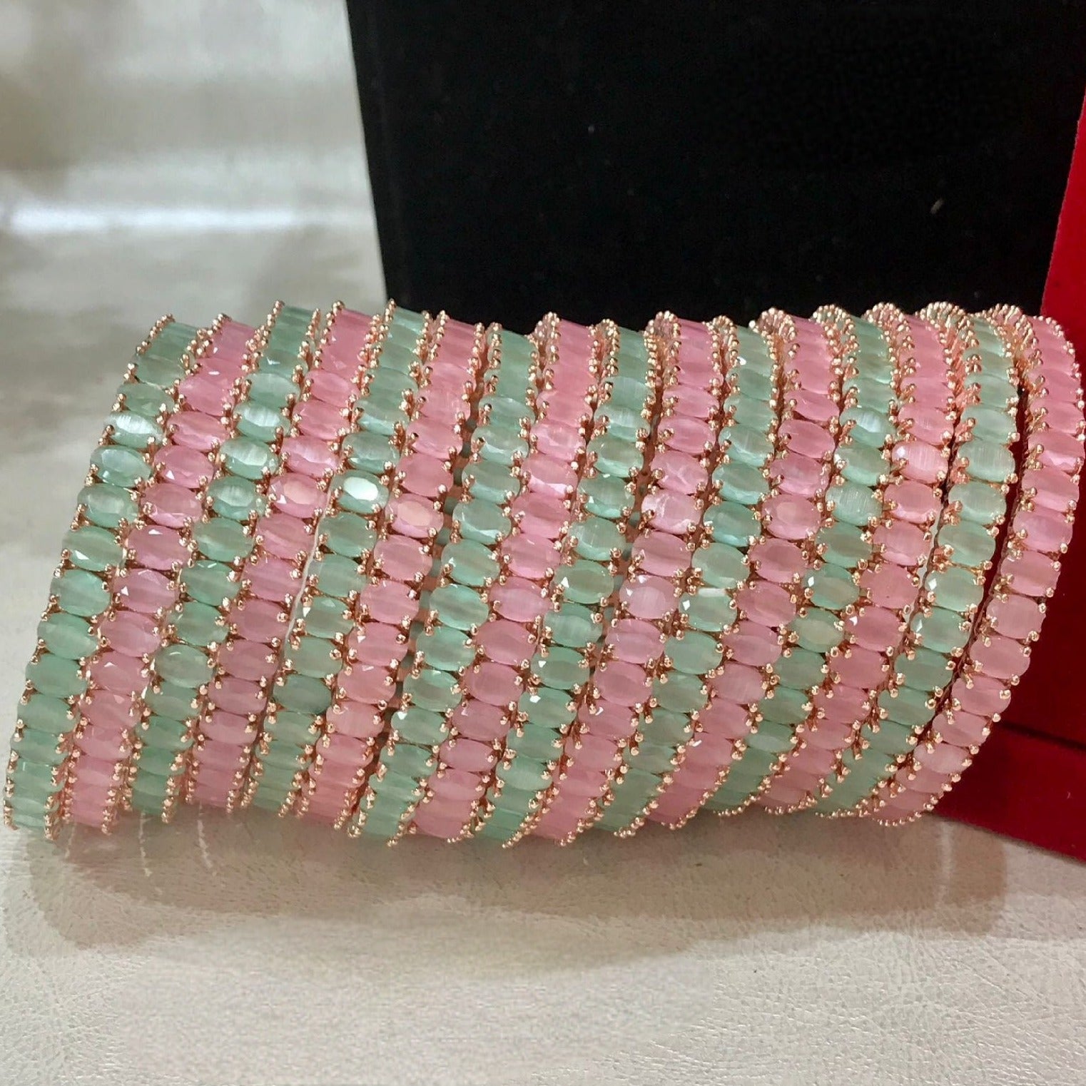 Each bangle in this set has been meticulously embellished with glistening American diamonds that sparkle and shine like the real thing. The fusion of delicate mint green and soft baby pink hues adds a touch of grace and sophistication, making this set a perfect companion for both formal events and casual gatherings.